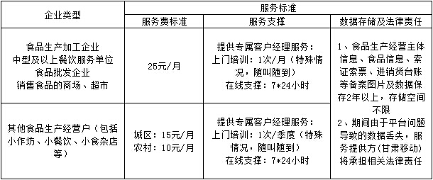 甘肃省食品安全追溯信息平台是依据《甘肃省食品安全追溯管理办法(试行)》(甘政办发〔2014〕14号),由甘肃省食品药品监督管理局依托社会第三方(中国移动通信集团甘肃有限公司,下称“甘肃移动”)建设的。食品生产经营者接入使用甘肃省食品安全追溯信息平台,由甘肃移动收取平台服务费,并提供数据存储(食品生产经营主体信息、食品信息、索证索票、进销货台账等备案图片及数据保存2年以上)、上门培训、在线支撑等服务,且期间由于平台问题导致的数据丢失,甘肃移动将承担相关法律责任。 现将平台服务费标准公告如下: 以上服务标准自2014年8月1日起执行,同时根据甘肃省食品药品监督管理局要求,为保障广大食品生产经营者切身利益,降低使用成本, 甘肃移动将随着平台接入食品生产经营者数量的增多,对服务费标准实施逐年下调。 特此公告。