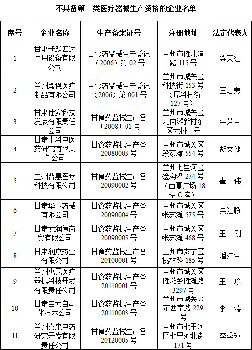 按照《医疗器械管理条例》《医疗器械生产监督管理办法》和有关文件规定,甘肃自力自动化技术公司等11家企业不具备第一类医疗器械生产企业资格,特此通告。