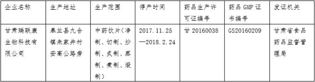 甘肃瑞联康生物科技有限公司向我局申请停产,我局研究同意该公司自2017年11月25日至2018年2月24日暂停药品生产,在停产期间不得开展药品生产活动。