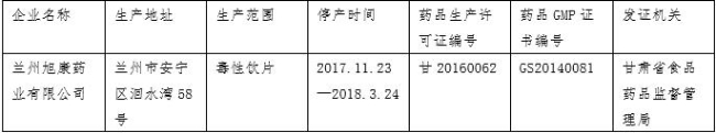 兰州旭康药业有限公司向我局申请毒性饮片生产车间停产,我局研究同意该公司自2017年11月23日至2018年3月24日暂停毒性中药饮片生产,在停产期间不得开展毒性中药饮片生产活动。